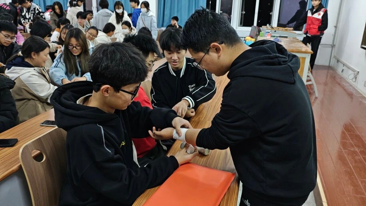 培训现场,红十字会成员率先开展包扎技能教学,详细拆解头部、手臂等常见部位的包扎要点,随即下发绷带,一对一指导同学们实操练习,规范操作流程。